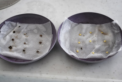 | 左の黒っぽい種が種袋に入れて保管していたのは、種の周りが腐れ赤い皮が黒くなっていた。 生き残る可能性がありそうな種だけを皿に置いていたが、やはりこちらの種は発芽しなかった。 右のきれいな色の種は野外保存の種で、今回芽が出たのでポットに移植した。 |