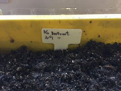 | こちらは、窓辺の薄いプラスチック容器の中の箱に種を蒔いたBeetroot。 2月と3月に2回種を蒔いているのだが、まだ発芽していない。 |