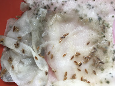 1週間ほど前にキッチンペーパーの上に種を蒔いたのは、トマトとイタリアンピーマン、フェンネルそしてBeetroot、さらにカボチャの種も加えてみた。