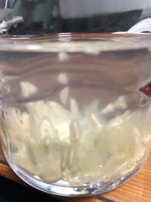 キュウリの種のゼリー部分には発芽抑制物質が含まれているとのこと(恐らく果実には種の周りに皆発芽抑制物質が付いているのだろう)で、これらは外しやすくするために一晩種を水に浸けていた。