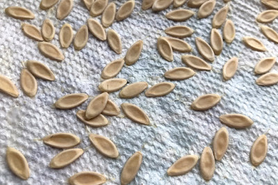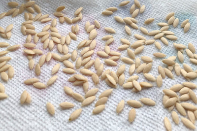 それで、完熟キュウリの種取りの時のように、種を茶こしに取り出して、軽くもう一度洗い、キッチンペーパーの上に広げたのが下の写真。