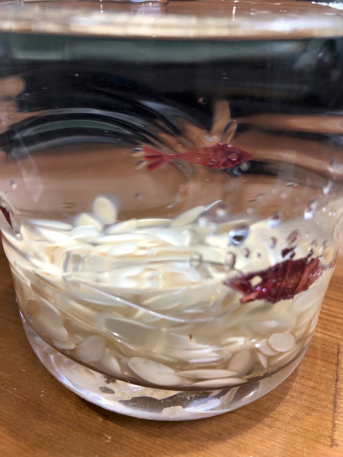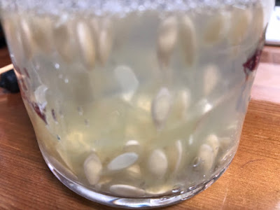 最初に鍋に種を取り出し、種がいっぱいの上澄みをすべて捨てコップに入れた種を観察した。