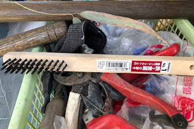 | ホームセンターで一番硬い金属ブラシを買ってきた。 100円しなかったので100円ショップのブラシより安い。 剪定バサミは、カイガラムシの付いた枝切りだけでなく、殻をこさぎ落とすのに使う。 |