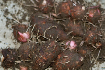 | 左奥の太い茎が主株。 手前の小さな茎にも小さな親芋が付いていた。ただその周りには子芋は付いていなかった。 ということは、やはりしっかり芽掻きをした方がよかったのかもしれない。 茎から上の部分は全てミミズ君の餌。大きいものも小さなものも親芋は来年の種芋になる。 |