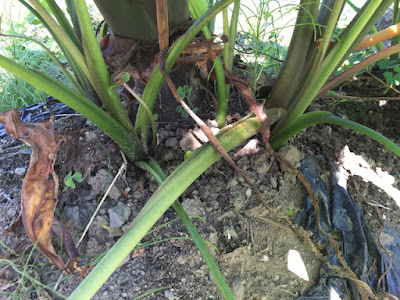 里芋の株の状態は、見た感じ、葉は青々と元気で、やはり収穫には少し早すぎる感じだ。