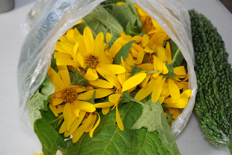 ところでこちらは、昨日収穫したキクイモの花とヤーコンの葉。どちらも私のスペシャルティーの材料だ。キクイモの花は今がシーズンで毎年今頃収穫している。