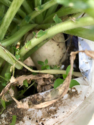 これら大根を植えている3つのビニール袋は、収穫が終わったら撤去して、そこにはサツマイモ用の土嚢袋を据える予定だ。