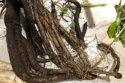 ダストボックス栽培では通常そこに当たったゴボウが直角に曲がりL字型ゴボウができるのだが、今年は更に先でひと曲がりしたものも採れた。