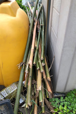 | こちらは先日切り出していた笹竹。 次の笹竹の出番は夏野菜を畝へ移植する5月だろう。 |