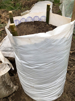ということで、菜園の端に1列に並んだ袋たちの、今年の活躍を乞うご期待だ。