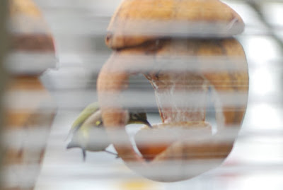 | 仕事場の部屋の中から眺める、窓の外のメジロ君の家。 晩白柚で出来た家もかなり老朽化してきたと思えるが。。 楽しんでくれているメジロ君のことを思うと、すぐには家は撤去できそうもない。 |