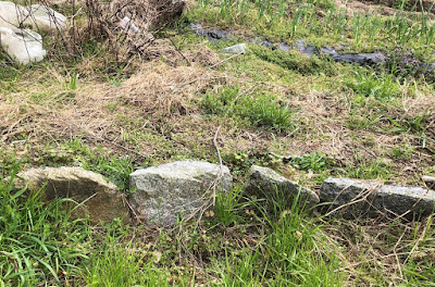 | この石の向こうに斜めになった波板が置いてある。 一度土を外して、できるだけ雑草も片付けていた方がよさそうだ。 波板栽培の横では昨年は割竹栽培にもチャレンジしたが失敗。 |