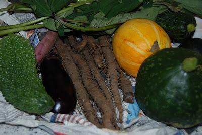 最近ではトマト、ピーマン、キュウリなどの夏野菜が収穫出来なくなった。 自然発生苗からのゴーヤはまだ立派なのが収穫出来ている。 竹の棚によるカボチャの空中栽培はコリンキーを含めまだまだ収穫出来ている。 サツマイモや芋づるは食べる分だけを収穫している。 |