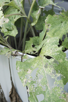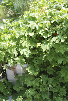 ゴーヤは夏野菜が元気なくなったこの時期元気に頑張っている。 お陰で、ゴボウを植えていたダストボックスに日が当たらなくたっていた。 |