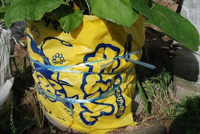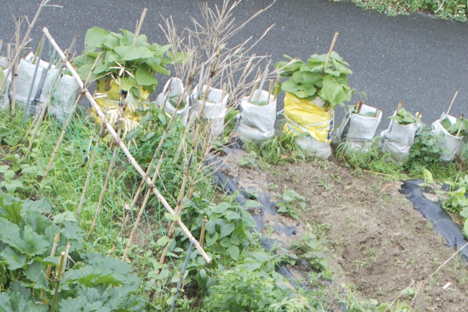 ということで、3日程前、雨がしっかり降り始める前に肥料袋のビニールを帯状に切り、ガラ袋に巻き付けて補強することにした。