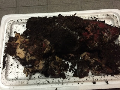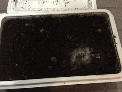 一見きれいに見えるサツマイモだが、腐れ始めていた。 芋を取り出した発泡スチロールもかなり臭い。 すぐに蓋をした。 |