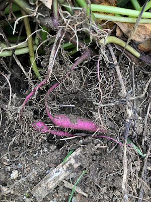 | 伸びた蔓の根からも、こんな中途半端な芋ができるのだ。 こちらに栄養を取られると、メインの芋が太らないのだ。 |