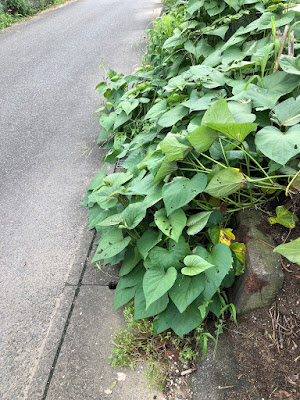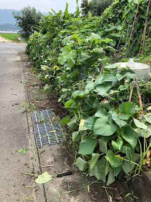 | 蔓が道路の方にはみ出すと、通行する方の邪魔にもなる。 苗の蔓返しは一石2丁の作業になる。 |