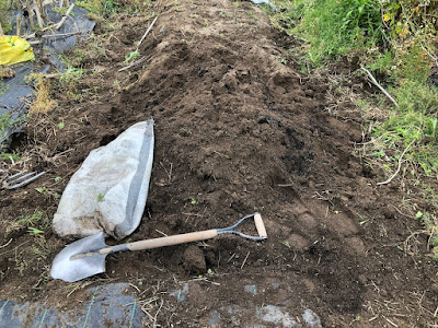 | 畑の土に、牛糞堆肥や鶏糞堆肥を混ぜ込んでいる。 そんな土をスコップで次々に入れ込んでいった。 |