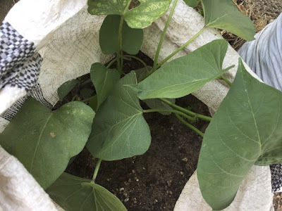 数年前までは地植えでも育てていたのだが、大きな芋が採れる可能性は地植えの方があるのだが、モグラ被害があまりにひどいので、今年はすべての苗を土嚢袋で育てることにした。