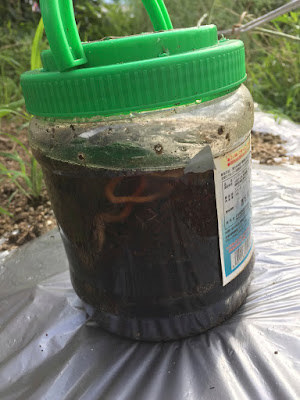 今月はシマミミズの寿命実験第3弾、39ヶ月半目のチェックの予定だったが、先日の雨の後見に行ったら、排水が悪かったようで、観察小屋の中に水が溜まっていた。