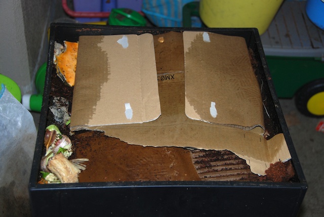 上の方のダンボールはまだ変化ない。 中頃のダンボールはかなり崩れて、ミミズ堆肥も少し出来ているようだ。 写真では分かり難いが、元気なみみずもたくさん見えた。 |