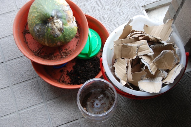 その縮んだダンボールと、餌のカボチャを下の写真の様に、ギュウギュウ詰めにした。