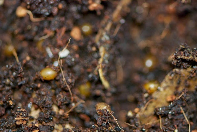 | 150個程入れた卵胞が全て残っているかなど知る由もない。 それでも広げた観察小屋の内容の中に、十数個の卵胞はすぐ見つけることが出来た。 |