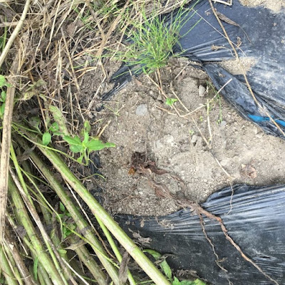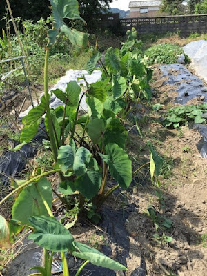 ここには最初植える予定はなかったのだが、とても立派な『赤芽大吉』の小芋を4月に頂いたので、10個程順行植えしておいた。