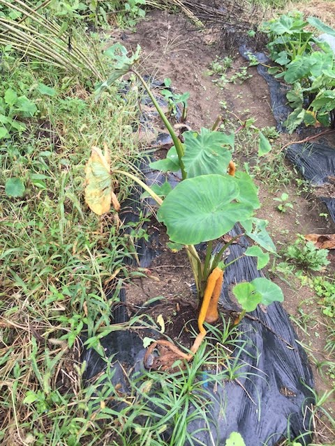 ここは第1菜園の、大きな親芋を逆さ植えしている畝。