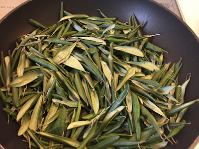 | オリーブの葉をフライパンの上で炒ってほうじ茶を作っているところ。 雨の日にできる仕事にはこんなものもある。 |