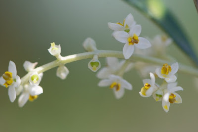 | 今年植えた1m程の小さな苗木に咲いた花。 実を付けるかどうか全く?だが、とてもきれいだ。 花びらが落ちた所に、実の赤ちゃんが付いていることだけは見て取れる。 |