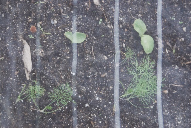 | 先日ポットから移植したばかりのフェンネルだが、ここにも側にカボチャの芽が出ている。 |