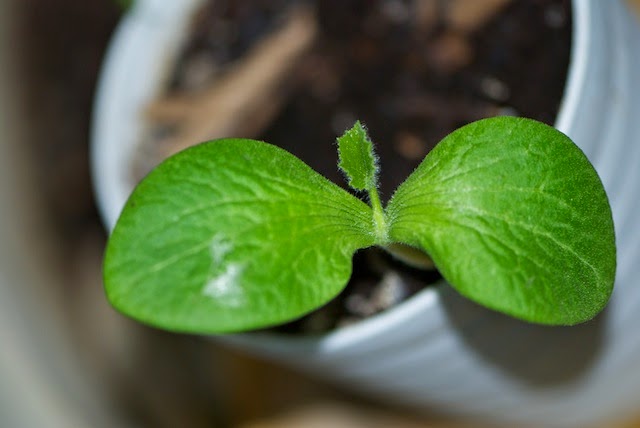 家の中のバジルの越冬を試みて失敗した小さなポットでは、カボチャがしっかり芽を出している。