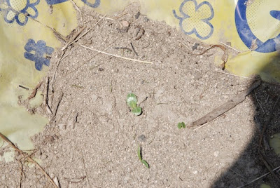 | 真ん中に見える小さな双葉がアーティチョークの芽だ。 数日雨が降らなかっただけで土はカラカラで、小さな芽には厳しそう。 明日は午前中雨の予報。適時の雨は本当に助かる。 |