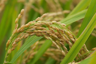 | 我が家の畑の前に広がる水田では、黄金色に色付き始めた稲が頭を垂れている。 この時期の台風は、農家の方にとってはさぞかし心配だろう。 |