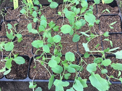 | こちらは、ブロッコリー、茎ブロッコリー、スペインキャベツなどの苗だ。 春、畝に植え付ける苗は、秋植えの苗よりかなり小さくてもいいらしい。 まだ小さな苗だが、近いうちに畝に移植する予定だ。 |