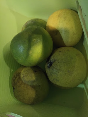 | 完全に青い実2個だけを残して、まだ青っぽい実も当然収穫して帰った。 来年から、晩白柚にマジックで何か刺激的な言葉でも書いておこうか? |