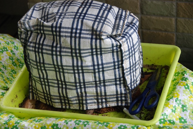| 僅かの保温を期待して、外側に保温効果のある使い古しの弁当袋を被せておいた。 |