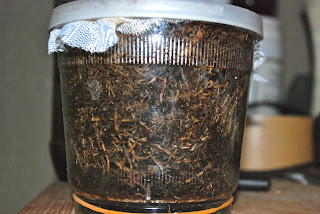 前回のひげ実験で小さな瓶で20匹の子供&青年ミミズが2カ月成長するのに全く問題がなかったので、5倍の容量に赤ちゃん20匹なら、水分補給を月に1回ほど行えば餌も何も与えないで1年間はそのまま元気に成長するだろう。