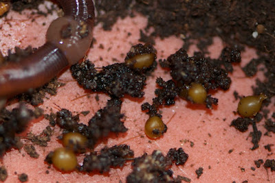 | 3年と6ヶ月になる最長寿命記録を樹立したミミズ君たちが卵胞を産み落としている。 しかも、5匹のミミズで11個の卵胞なので、この1ヶ月で1匹が2個産んだことになる。 写真左上に見えているのが、ミミズ君の膨らんだ環帯。 |