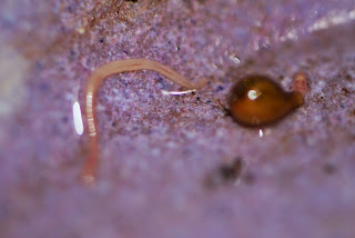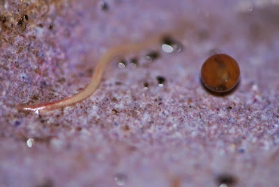| 赤ちゃんミミズは卵胞から出て来た瞬間と比べ、僅か数分の違いなのだが赤みが増してきた。 卵胞の開口部は赤ちゃんの誕生前と比べると心持ち広がっているように見える。 |