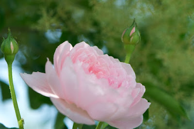 | 右隣にある黄色モクレンもかなり大きくなってきた。 2本の木の間に、数年前小さな弱ったバラの苗を移植した。 ここに移してからは苗も大きくなり立派に花をつけるようになった。 |