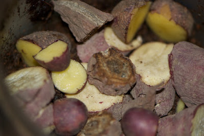 | なぜか、野菜庫の奥に食べ忘れて乾いていたサツマイモがあった。 環境悪化予防にはもってこいの餌だろう。 |