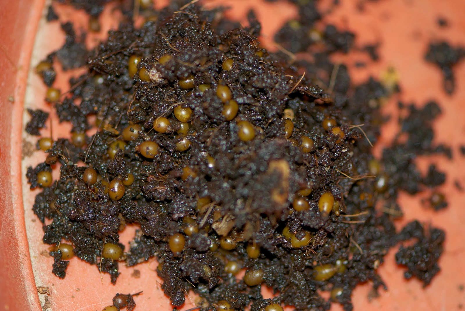 | 表面には少ししか見えていないが、堆肥の下にたくさんの卵胞が埋まり全部で230個! それにしてもこれだけの卵胞があって、赤ちゃんが1匹も見つからないのは不思議で仕方ない。 来月の最終チェックでは、これら多くの卵胞を数えなくてよいのはせめてもの救いだ。 |
