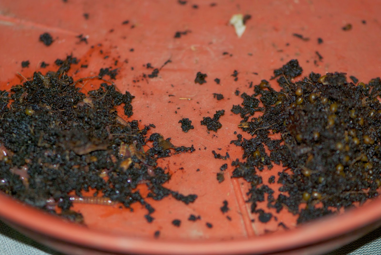 下の写真は左側に大人ミミズ、そして右側に卵胞を集めたところ。