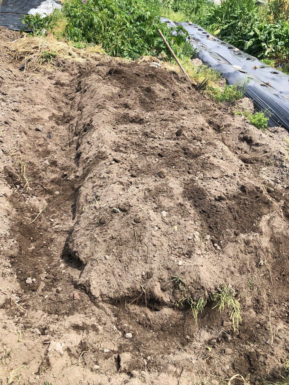 入れ込んだ苗が乾いた後、踏みつけてその上にたっぷり土を被せ高い畝を作った。