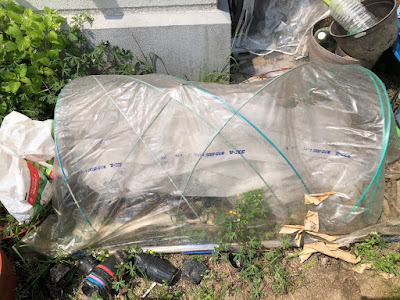 | こちらは、芽出しに去年一番うまくいった方法。 ビニールトンネルの暖かい環境の中に2ヶ月近く置いていた。 |