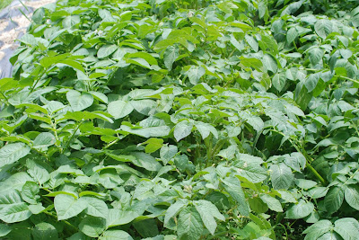 | ざっと見たところ男爵芋が5株くらい、デストロイヤーに1株、根元に芋の露出が見られた。 このままだと、食べれない緑化した芋が出来てしまう。 |