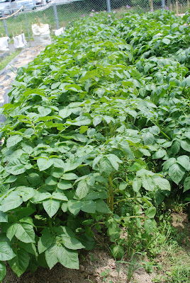 | 一つの畝には向かって右側にデストロイヤー左側に男爵芋を植えている。 遅く芽が出てきたデストロイヤー、最近の育つスピードは早い! |